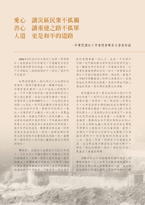 此次汶川賑災工作,本會結合兩岸各級紅十字組織、災區政府、整合臺灣 34 個 NGO 團體成立服務聯盟以及扶持當地剛萌芽的非政府組織及社工人力通力合作方能有今日成果,希望能將此寶貴的救災模式與經驗複製並與各界分享,陳會長並呼籲兩岸能有更多的社會資源,持續協助當地軟體重建。