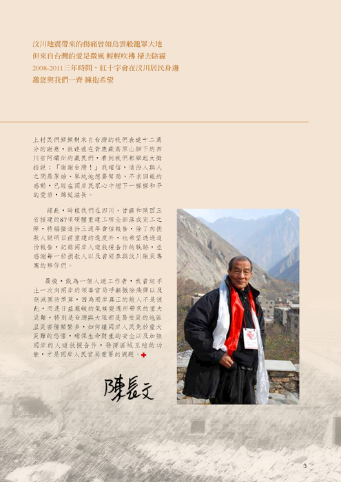 中華民國紅十字會總會陳長文會長於民國100年 9 月 21 日至 28 日率領工作人員等一行前往大陸汶川地震災區訪視,實地瞭解災後三年多來軟硬體重建工作進度與成果。目前本會在川、陝、甘三省的硬體項目已全數完工,執行率 100% ,至於為期 6 年的軟體重建計畫,則依進度如期並擴大執行中。