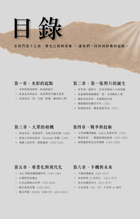 《相機進化史》帶領讀者回顧影像科技百年來的變遷,從最早的暗箱原理、濕版攝影,到膠片相機的黃金年代,再一路走向數位革命與智慧型手機攝影的崛起。本書以清晰的時間軸與大量史料為基礎,深入介紹各種經典相機的誕生背景、技術突破與對攝影文化的深遠影響。