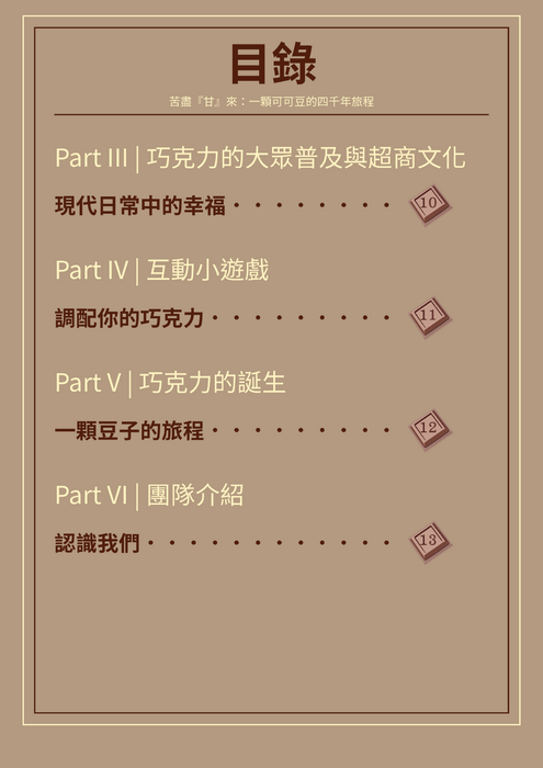 這本電子書以巧克力為主題,從可可豆的起源出發,回顧它在中美洲文明中的神話與宗教意義,並追溯巧克力如何隨著征服、貿易與工業革命,從苦澀的飲品轉變為現代日常的甜點。內容結合歷史、人文與科學製程,帶領讀者理解味道改變背後的技術與權力,也透過互動設計,邀請讀者親自體驗不同時代的巧克力風味,重新思考一塊巧克力所承載的文化與時代意義。