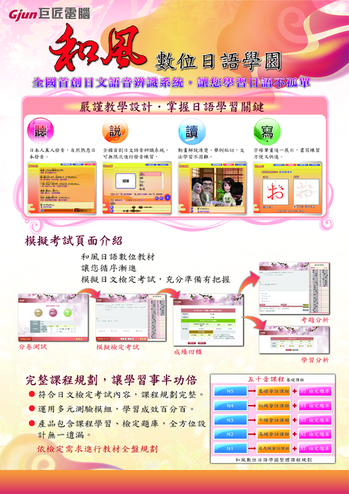 | 除了電腦教育訓練之外,巨匠期許朝向多元化教學服務,包括:企業團體包班、國際認證輔導、兒童電腦教育、線上數位學習、數位學習中心、美語教學服務,藉由營業領域的擴大,邁向多角化經營,向全方位的教學服務邁進! | ||