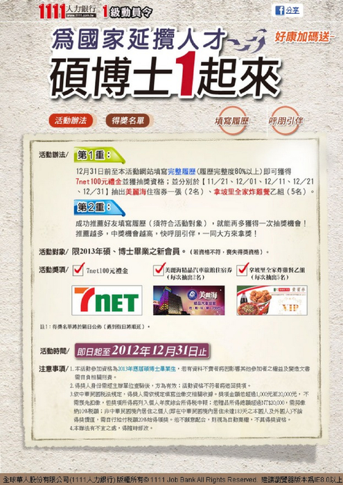作者:1111校園事業部 ╱ 日期:2012-10-25 ╱ 多媒體版 ╱ 已保護 0.00 棵樹Facebook 粉絲團
