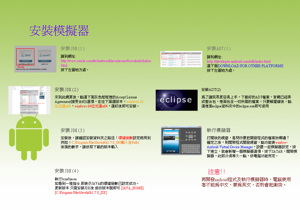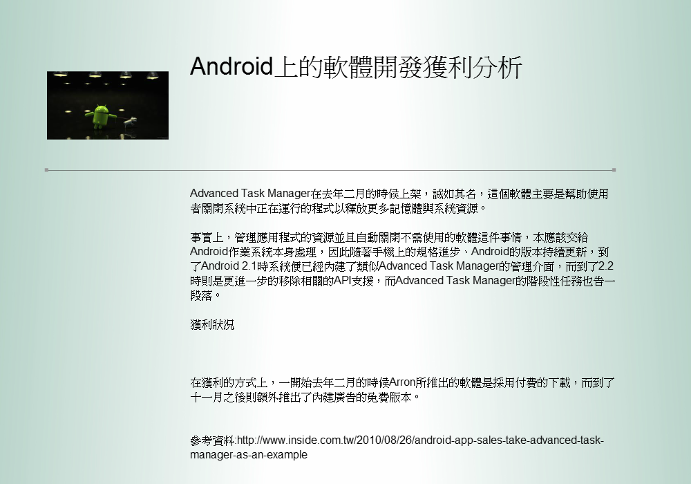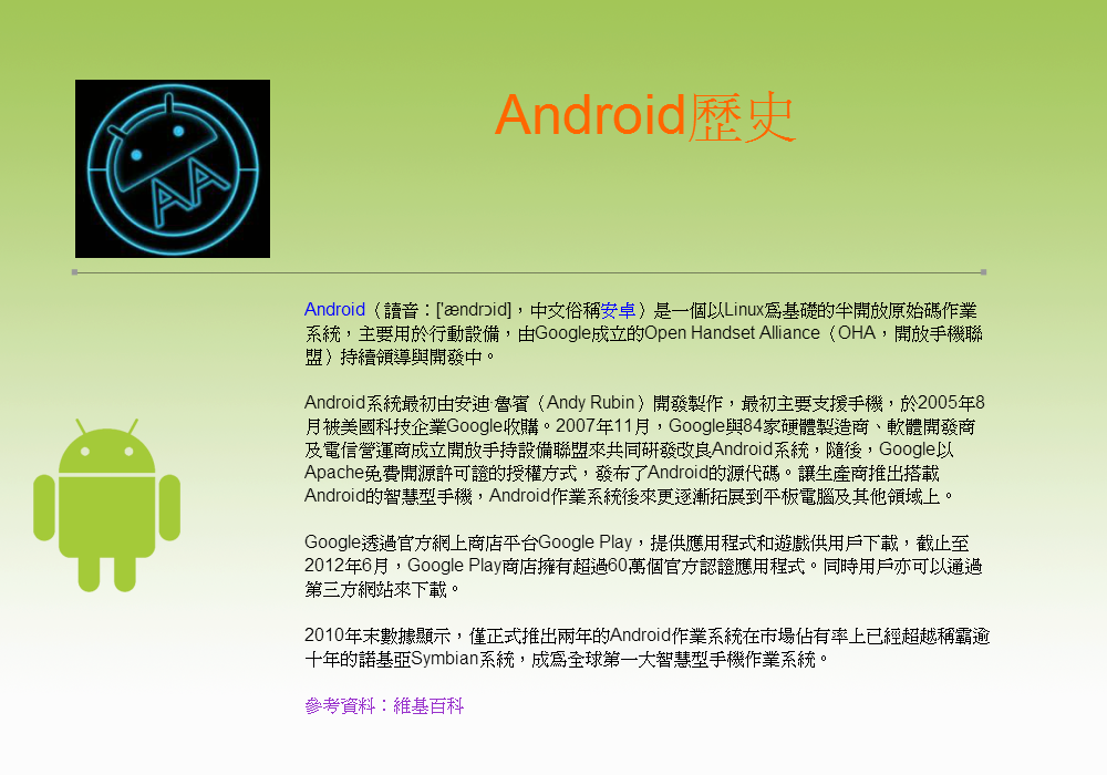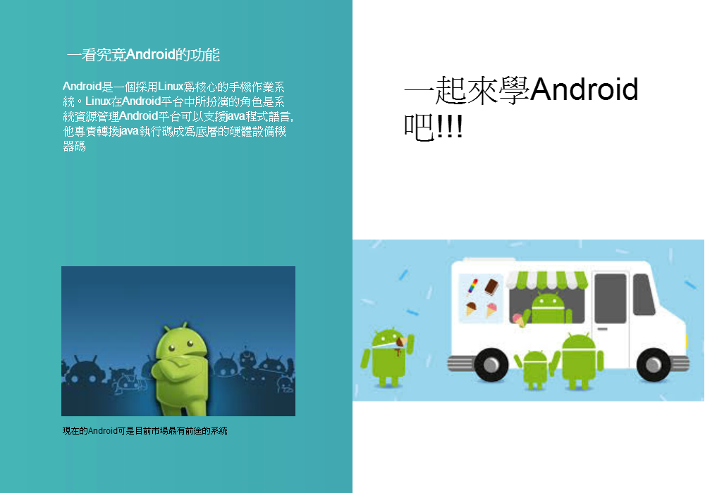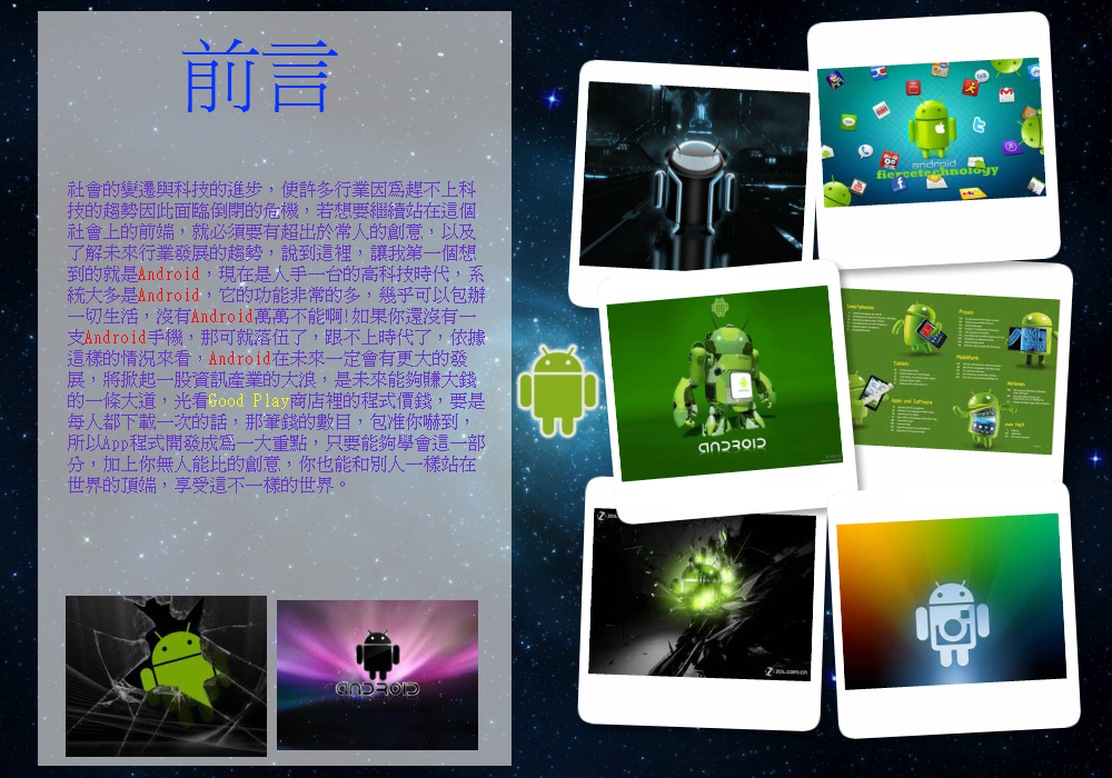 時代已邁向高科技社會,人手一台3C產品,Android是現在普遍於生活中的系統程式,手機、平板電腦這些智慧型產品......等,幾乎擁有Android系統,而Android在程式上有多方面的發展,Android程式系統都有辦法開發,相信有接觸過Android的人,應該都已經知道Android有多厲害了。開發Android程式是每人都可以做的,但對於我們這些高職資訊科學生,想要當一名程式設計師,目前目標還太遙遠了,為了更進一步的往目標前進一步,我們選擇了Android,Android是未來最有趨勢,開發較容易的系統;但想要發展這方面的原因不只是表面上的因素,最大的原因是來自於我們的興趣,只要了解一些少許的東西,就能開發出大量程式,光聽到這些,會有人不想試試看嗎?想要賺錢的話,Android程式也相當有潛力,不過對於我們來說,那是提外話了,現在的我們只是專注於單方面的程式設計,享受設計程式的喜悅感和成就感,此刻,傳授大家我們的心得與感想吧!