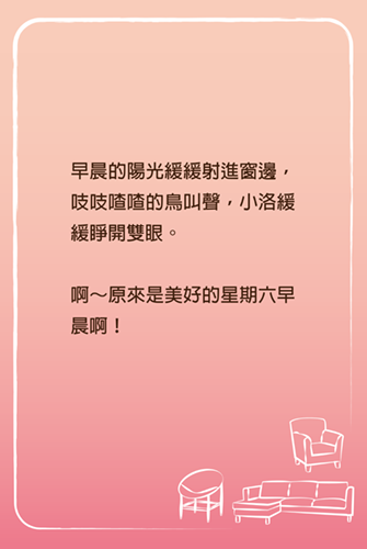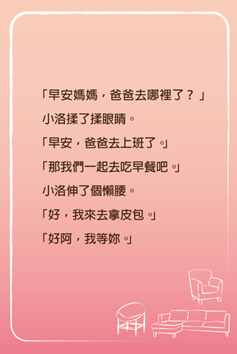 禮拜六一早,小洛起床刷牙洗完臉,走到客廳,發現爸爸出門了,便詢問媽媽,