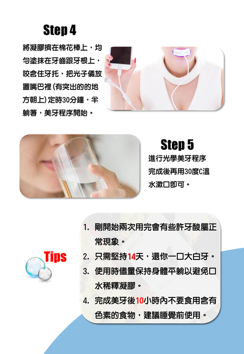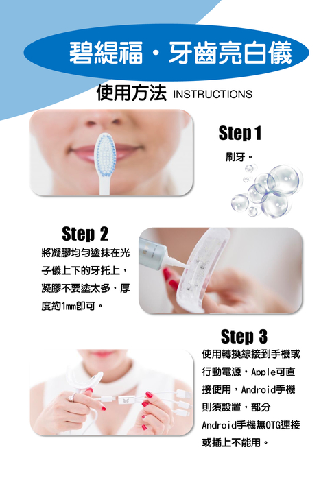 主要部件:光子儀1個、一拖三電源轉換線1根、冷光牙齒亮白凝膠1支15ml、牙擦10片、說明書1份、比色卡1張。