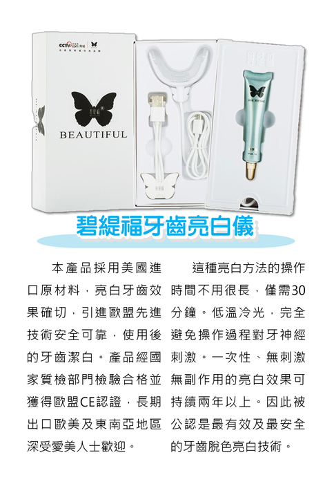 本產品採用美國進口原材料,亮白牙齒效果確切,引進歐盟先進技術,安全可靠,使用後的牙齒潔白亮麗,逼真自然。產品經國家質檢部門檢驗合格並獲得歐盟CE認證,長期出口歐美及東南亞地區,深受廣大愛美人士歡迎。