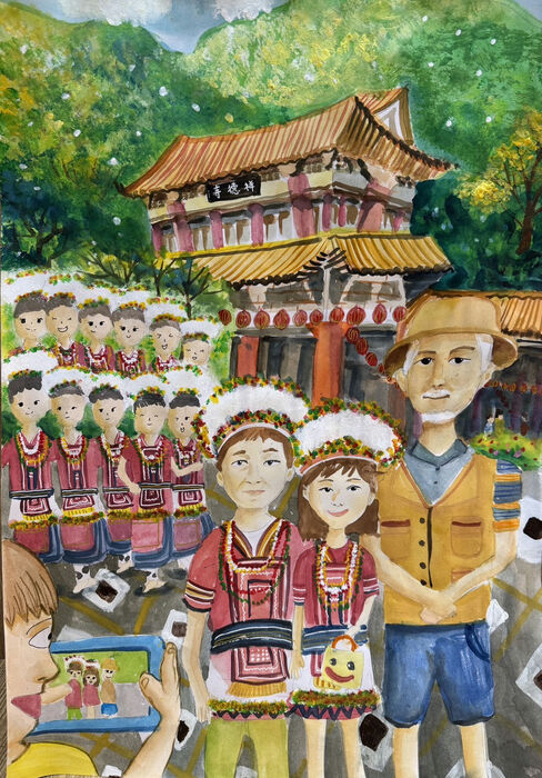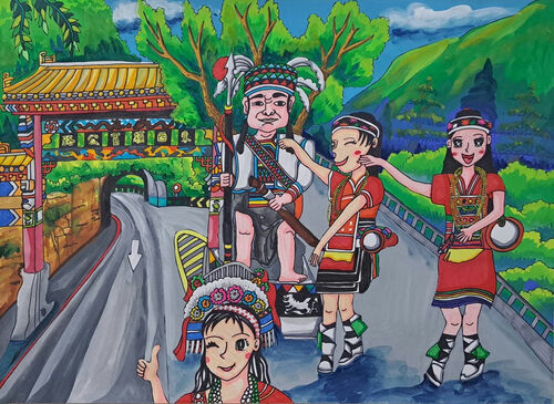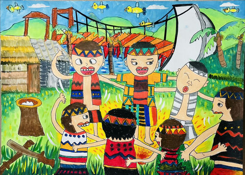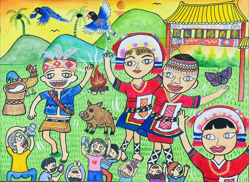 我畫的是部落的婚禮,新娘坐在花轎裡,臉上帶著幸福的笑容。大家穿著漂亮又有特色的衣服,手牽手一起唱歌、跳舞,熱鬧又開心。四周開滿了五顏六色的花,好像天空也灑下花雨,為他們送上最美的祝福。這是一場充滿笑聲的喜事,也是我心中最快樂的畫面。