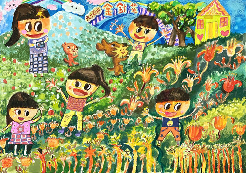 我畫的是花蓮六十石山的金針花海,滿山的花開得好漂亮。我跟家人在花海裡跑來跑去,我也畫了小狗一起玩耍的畫面覺得很開心。天空有彩虹與美麗溫暖的房子,大家的臉上都滿滿笑容。我想告訴大家,花蓮真的很美,金針花海像一片金色的海洋,希望大家都能來看看,也一起愛護大自然。