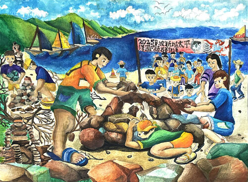 花蓮新城舉辦的疊石藝術季。大家一起在海邊撿石頭、疊石頭,背景有藍色的海洋和五彩的帆船,還有熱鬧的觀眾一起參加。透過不同大小的石頭堆疊,我想表現人和自然的互動,也傳達合作與創意的力量。花蓮面向太平洋,有壯麗的海岸和豐富的文化活動,我希望用這幅畫,讓大家看見藝術季的快樂與花蓮海洋的美。