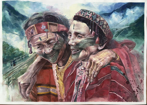 紋面,是少數原住民擁有的文化特色,而也是花蓮太魯閣族的傳統文化。這幅作品以二位紋面人為主要元素,再加上後面的花蓮風景,讓這幅作品有了顏色上的冷暖之分。