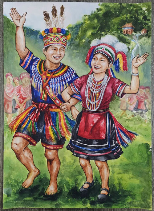 這幅畫描繪了花蓮原住民身著傳統服飾,在山巒映襯下盡情舞蹈的場景,舞者們臉上帶著自信與喜悅,手上的動作充滿力量,頭上的羽飾象徵著族群的榮耀與精神。舞蹈不僅是一種表演,更是一種文化的延續,代表著祖先智慧與生活方式的傳承。透過音樂與舞步,原住民的文化在世代之間流動,展現出與土地緊密相連的生命力。