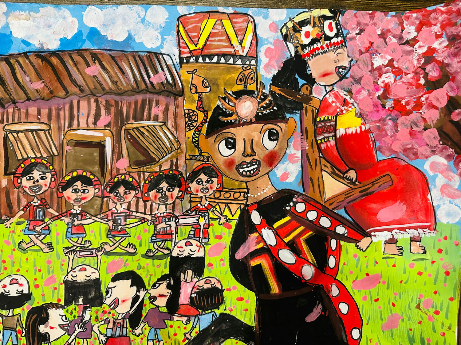 我畫的是部落的婚禮,新娘坐在花轎裡,臉上帶著幸福的笑容。大家穿著漂亮又有特色的衣服,手牽手一起唱歌、跳舞,熱鬧又開心。四周開滿了五顏六色的花,好像天空也灑下花雨,為他們送上最美的祝福。這是一場充滿笑聲的喜事,也是我心中最快樂的畫面。