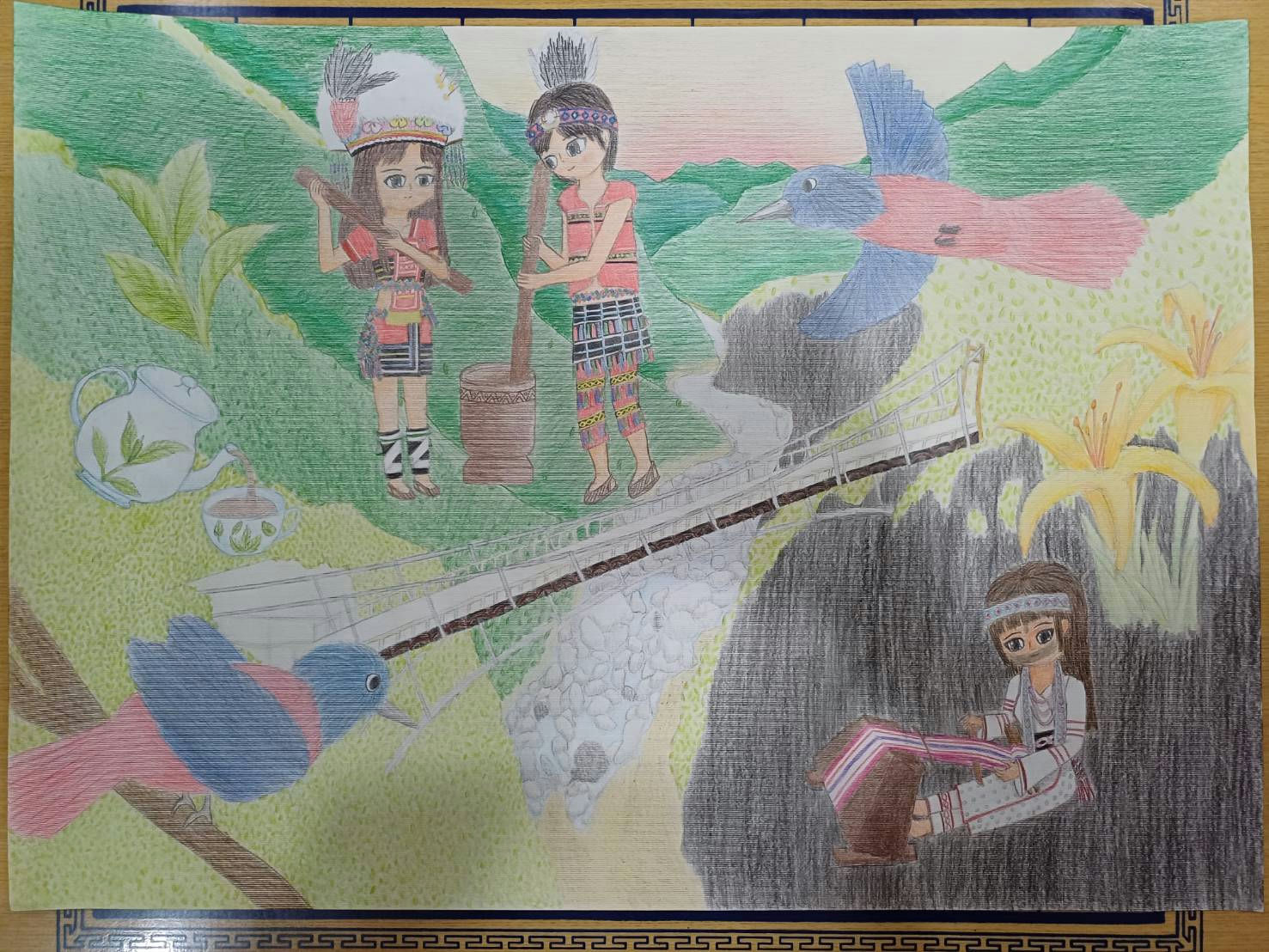 畫中融合花蓮自然風景的壯觀與秀麗,加上人文藝術及生態之美,呈現出多元及兼具傳統的美好風情。